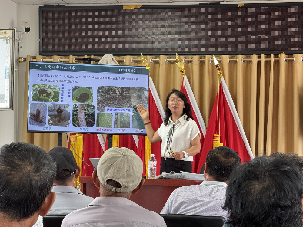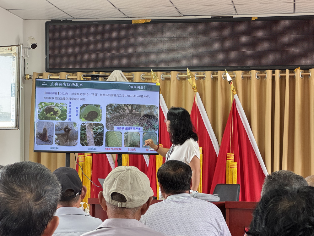 2025年8月25日,昌果所核桃团队应辽宁省经济林研究所邀请,赴辽宁省核桃主产区建昌县进行核桃园主要病虫害防治技术培训,建昌县林业相关技术人员及当地核桃种植大户等50余人参加培训。