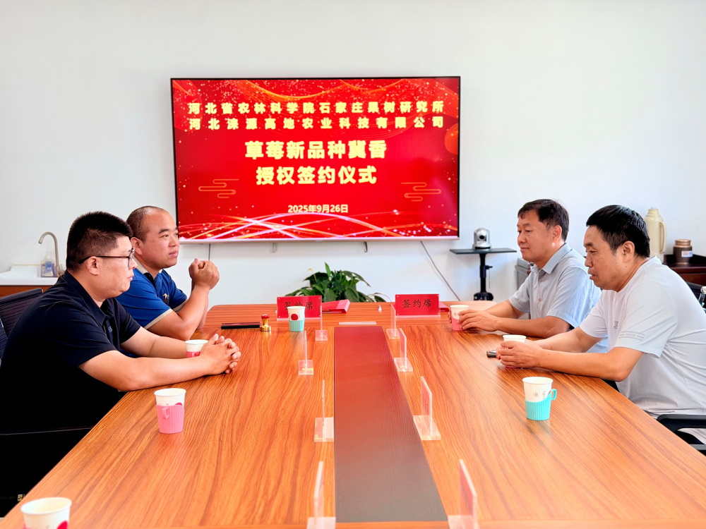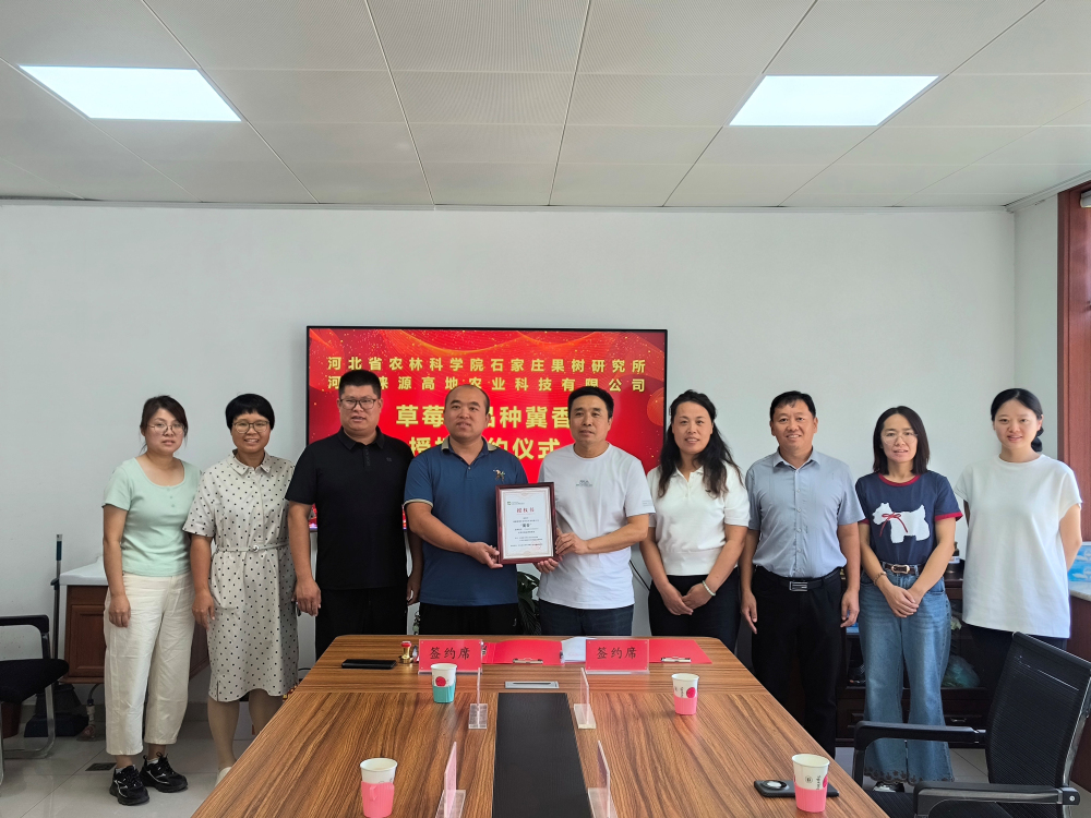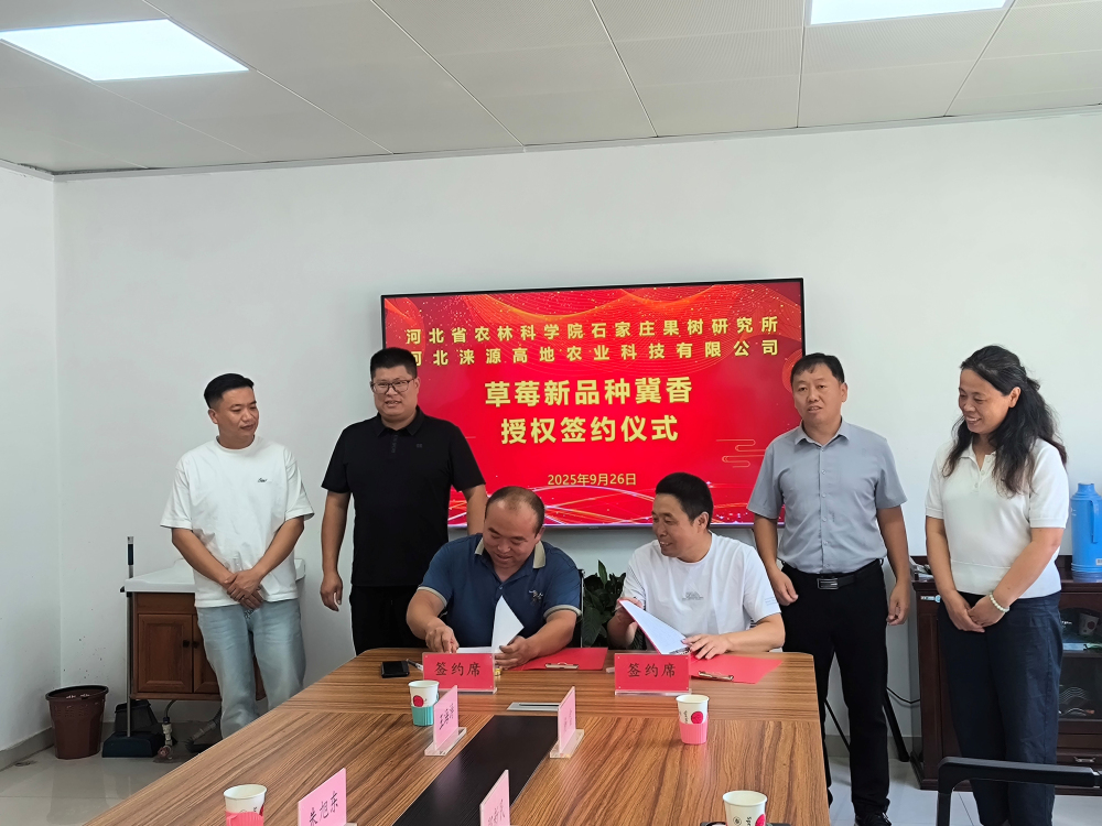 2025年9月26日河北省农林科学院石家庄果树研究所选育的优良夏草莓新品种“冀香”在石家庄果树研究所再次成功授权签约,授权方为保定市涞源高地农业科技开发有限公司。河北省农林科学院石家庄果树研究所所长鄢新民、草莓研究室团队成员及科技管理相关人员、涞源高地农业科技开发有限公司负责人王海涛及相关人员参加了授权签约仪式。