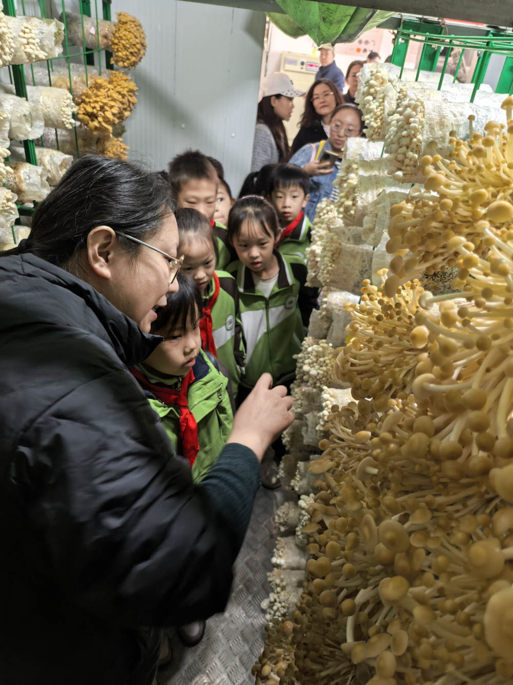 讲座结束后,学生和家长们来到食用菌出菇房实地参观。走进金针菇现代化菇房,整齐排列的菌棒,白色、黄色和褐色的多彩金针菇子实体,让学生们惊叹不已,也让它们对现代食用菌工厂化的栽培模式有了直观的认识。学生们还现场看到了灵芝、榆黄蘑、茶树菇、鸡腿菇等多种珍稀菌类。