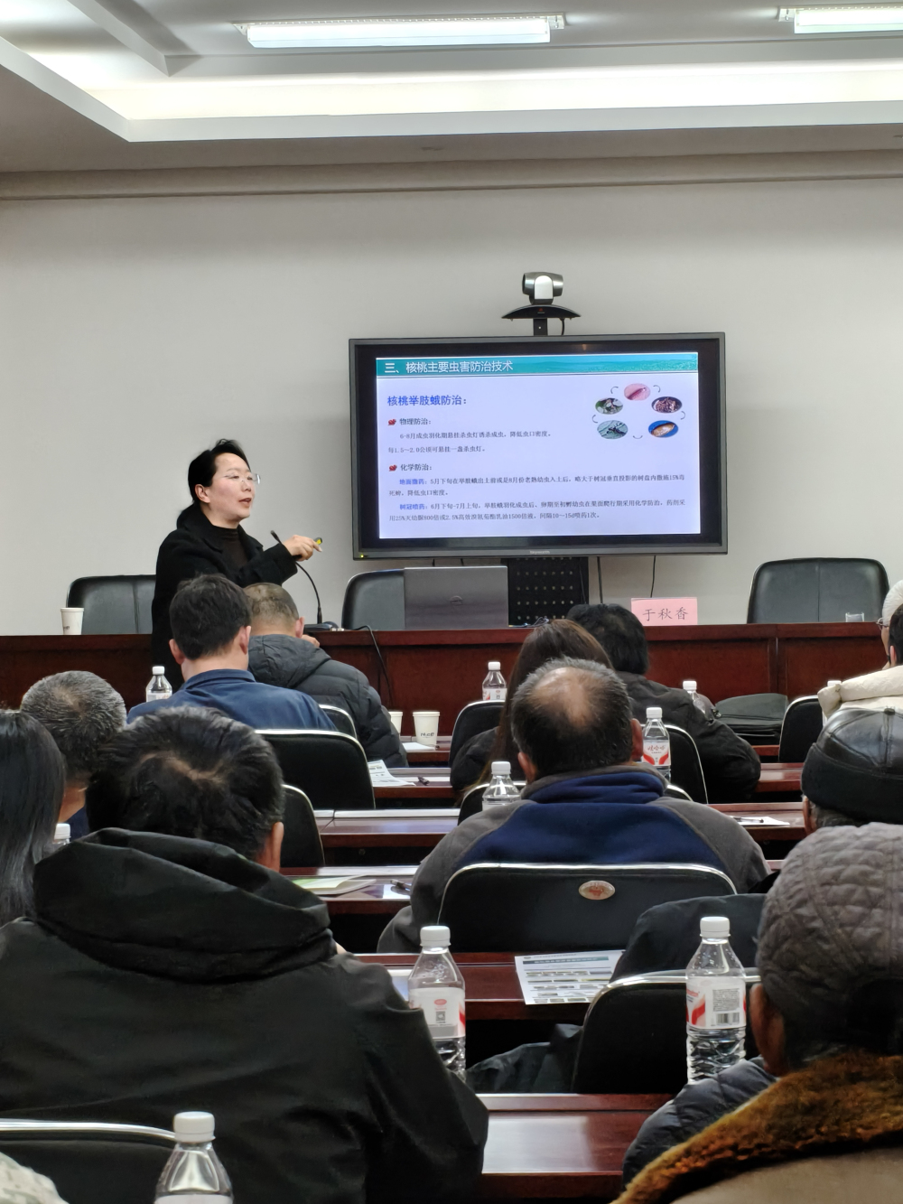 昌果所核桃研究室主任、副研究员、省林果花卉产业支撑团队专家于秋香,针对核桃主要病虫害,详细讲解了核桃细菌性黑斑病、炭疽病、枝干腐烂病及核桃举肢蛾、美国白蛾等常见病虫害的识别特征、发生规律,提出关键防治期并重点推广了绿色安全防控技术,引导种植户摒弃传统防治模式,实现绿色生产、提质增效;卢龙县自然资源和规划局正高级工程师徐平,结合自身多年科研与实践经验,用通俗易懂的语言、鲜活务实的案例,系统讲解了轻简化修剪的原则、方法和技巧,明确了冬季修剪、夏季修剪的关键要点,帮助参训人员掌握省力、高效的修剪技术,有效降低劳动强度,切实解决了种植户“剪不好、产量低”的痛点难题。