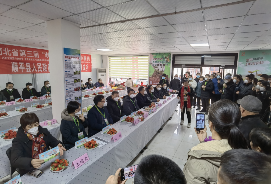 大赛由植保所、河北省蔬菜产业体系病虫害绿色防控团队专家顾问孙茜研究员主持,顺平县政府副县长侯英武在致辞中介绍了顺平草莓产业现状、存在问题和技术需求。王慧军组长对顺平草莓高质量发展提出了建议。二级巡视员王旗代表农业农村厅对活动的成功举办表示祝贺,提出顺平草莓产业虽起步晚,但发展很快,通过此次活动,可以将更多的优质草莓推向高端市场,对打造草莓品牌,促进草莓产业转型升级有重要意义。评比现场,红颜、粉玉、香野、圣诞红等芳香四溢,11位来自省、市、县果品专家从重量、果型、香型、实心度、含糖量、口感等方面打分评选,最终选出10名“草莓大王”和19名优胜奖获得者。