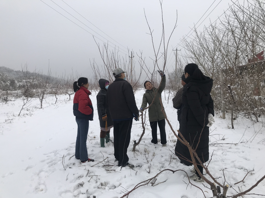 近日石家庄等地普降大雪,2023年2月10日,在白雪皑皑的杏园里,石家庄果树研究所李杏研究室武晓红主任正在给鹿泉栖泉农业生态谷的技术员进行培训。