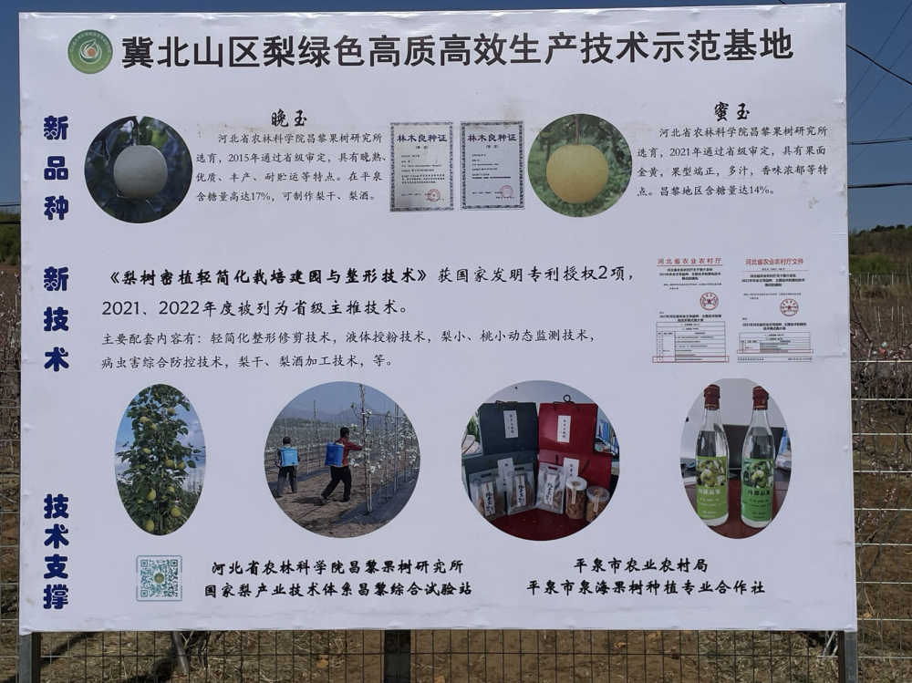 冀北山区梨绿色高质高效生产技术示范基地(平泉)以昌果所自研新品种和新技术为主要依托,示范有晚玉、蜜玉、灿玉(无核香梨)等梨新品系,以及省级主推技术《梨树密植轻简化栽培建园与整形技术》等新模式及其配套内容。