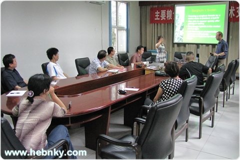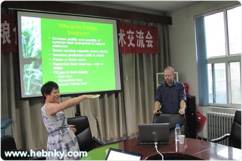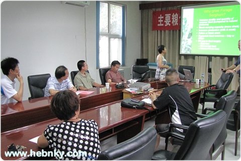 2011年6月23日-6月24日,澳大利亚太平洋种子公司高级研究员Wayne Chesher博士、国家牧草产业技术体系岗位科学家中国农业大学博士生导师王显国教授、国家牧草与饲料发展研究中心技术总监房丽宁博士一行三人,到我院农业资源环境研究所进行考察交流。 刘忠宽博士做了河北省牧草以及青贮方面进展汇报,澳方专家就饲用高粱的育种、栽培、病虫害防治、青贮、加工做了系统的学术报告。随后,科技人员就饲用高粱防治根结线虫、扁豆与青贮玉米混种能够提高青贮玉米品质等方面进行学术讨论并达成初步合作意向。