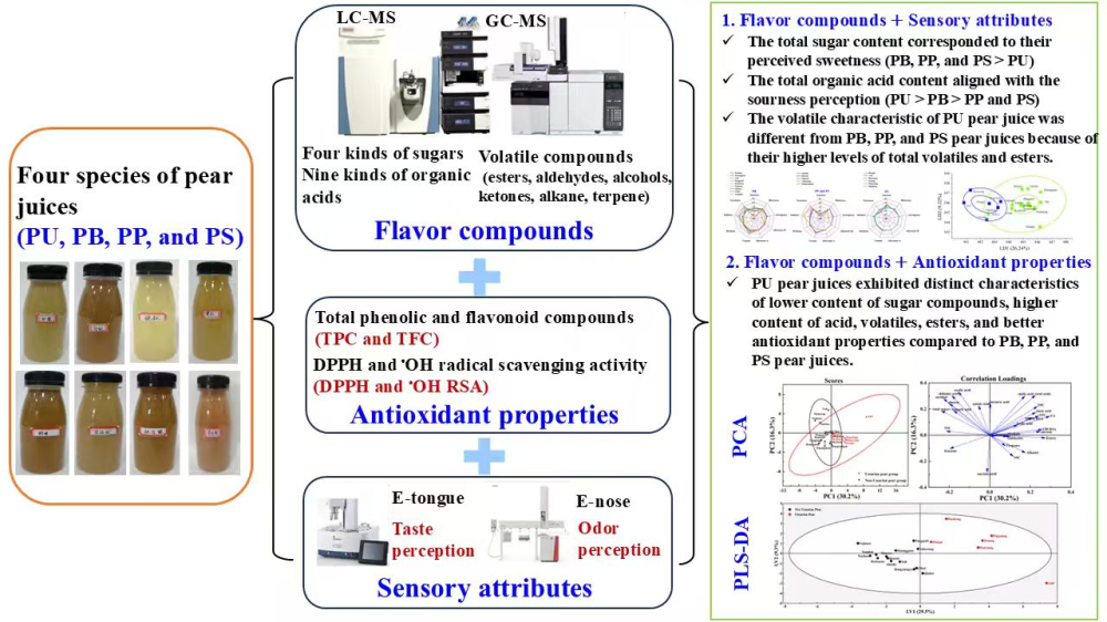 第一项研究论文题目为“Investigation on flavor compounds, antioxidant properties, and sensory attributes in pear juices”。该研究系统分析了20个不同品种梨汁的风味特征和抗氧化活性,发现秋子梨梨汁在甜酸协调性、香气丰富度以及健康潜力方面表现突出,为梨汁工业化生产中适宜加工品种的筛选提供了科学依据。