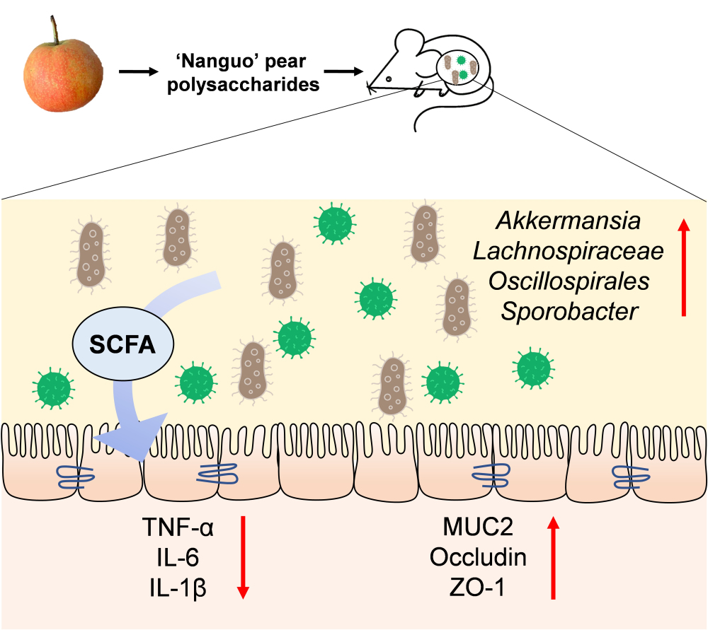 第二项研究以“Structural characterization of polysaccharides from ‘Nanguo’ pear and its protective effect against inflammatory bowel disease in mice via modulating gut microbiota”为题,聚焦梨果多糖的结构与功能。研究团队完成了南果梨多糖的分离纯化与结构解析,并进一步揭示其通过调节肠道菌群、促进短链脂肪酸产生,从而有效缓解小鼠炎症性肠病,该成果为梨果多糖的深度开发与高值化利用提供了理论支撑。
