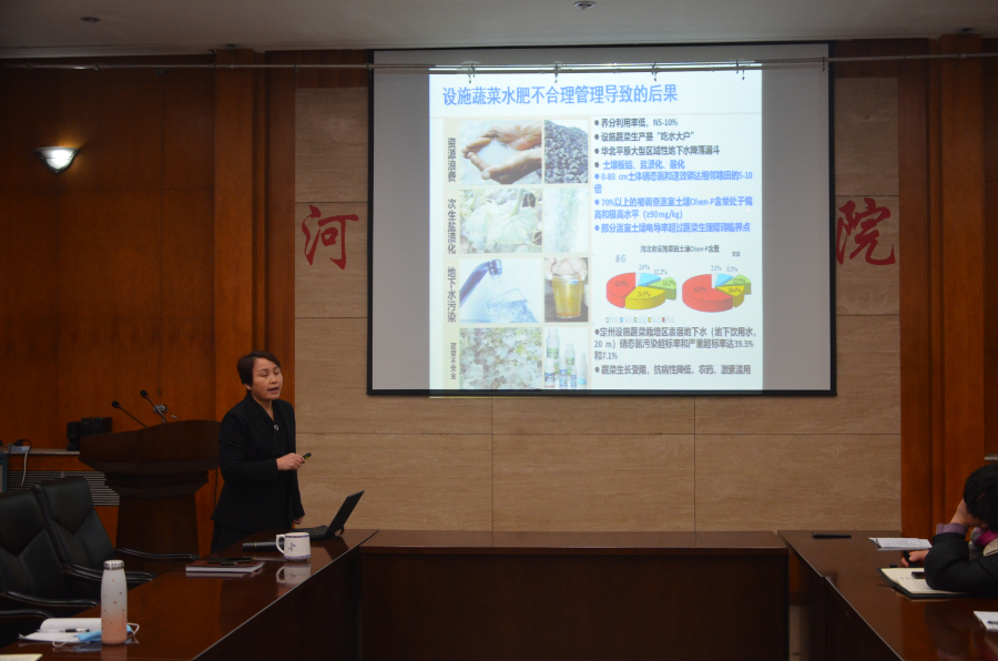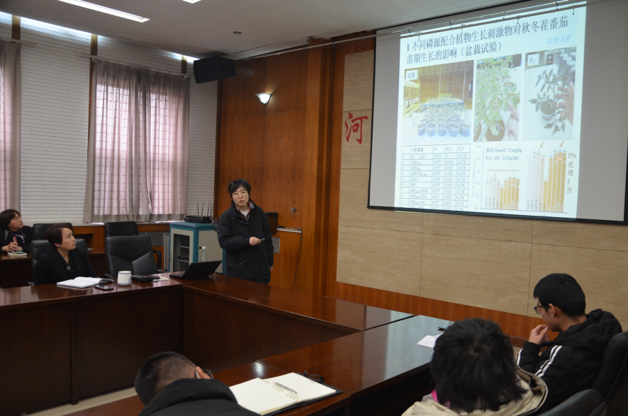 此次学术交流主要由肥料技术研究室王丽英研究员、李若楠研究员、史建硕助理研究员和蒋龙刚四名同志分别围绕《设施蔬菜养分管理研究梳理与展望》、《不同磷源及肥料增效助剂对土壤供磷能力及设施番茄磷素吸收利用的影响研究》、《植物对氨基酸的吸收利用及氨基酸在农业中的应用》和《不同微藻用量对滴灌日光温室土壤质量及蔬菜产量品质的影响》为题作了学术报告。每场报告结束后,针对报告内容,与会人员都进行了深入交流研讨。此次学术交流活动,体现了浓厚的学术氛围,达到了预期目标,取得了圆满成功。