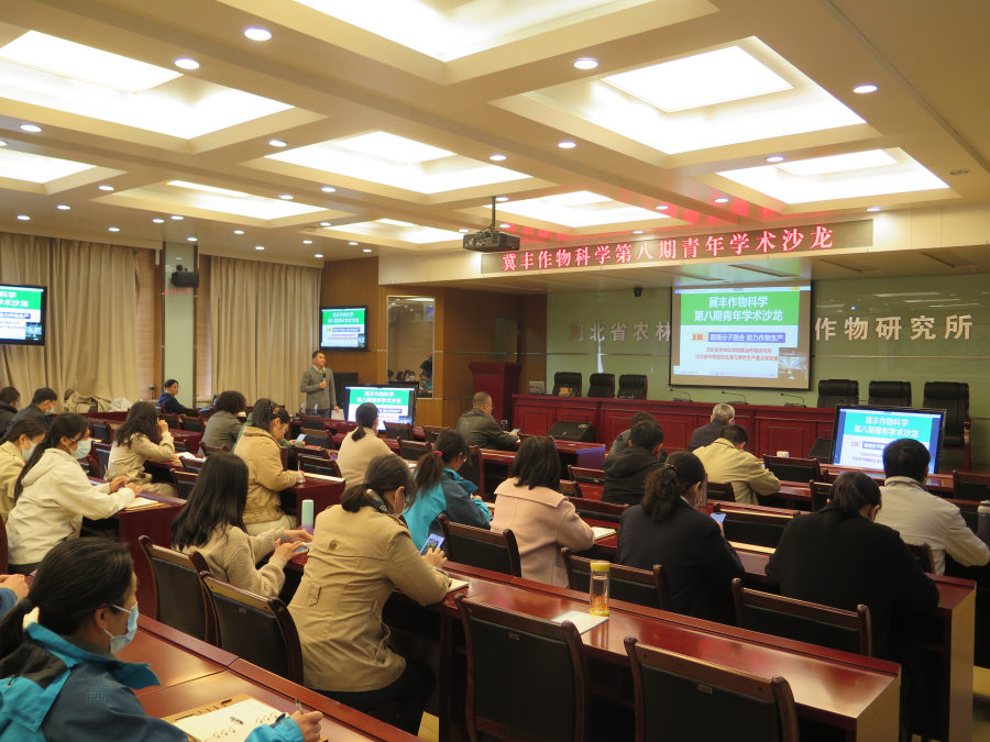 由于疫情防控要求,会议采取专家线上报告和听众会场集中参与的方式进行。粮油所、谷子所等从事作物栽培与分子生物学等相关研究的专业技术人员80余人参加了报告会。
