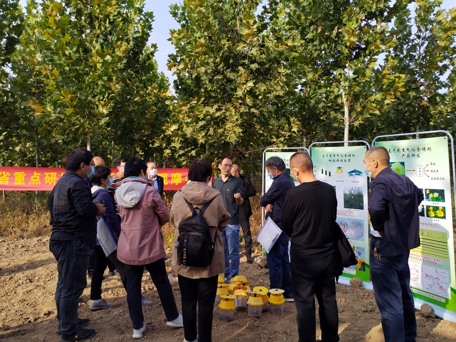 会上,项目主持人张涛研究员介绍了项目的研究背景,食诱剂创制思路和项目指标完成情况。专家组及参会人员现场观摩了食诱剂对棉铃虫、银锭夜蛾等蛾类害虫的引诱效果,并进行现场质询与答疑,最后对项目后续研究方向提出建议。专家组一致认为,该项目研发的食诱剂能诱杀较大比例的雌蛾,田间诱蛾效果稳定;对蛾类害虫具有较高的选择性,对蜜蜂、食蚜蝇等有益生物影响较小,可用于害虫的生物防控。同时,专家组建议项目组进一步提高产品诱杀活性,将产品应用范围扩大至玉米等主粮作物,并希望项目组加快产品产业化,为化学杀虫剂减量增效提供产品支撑和技术支持。