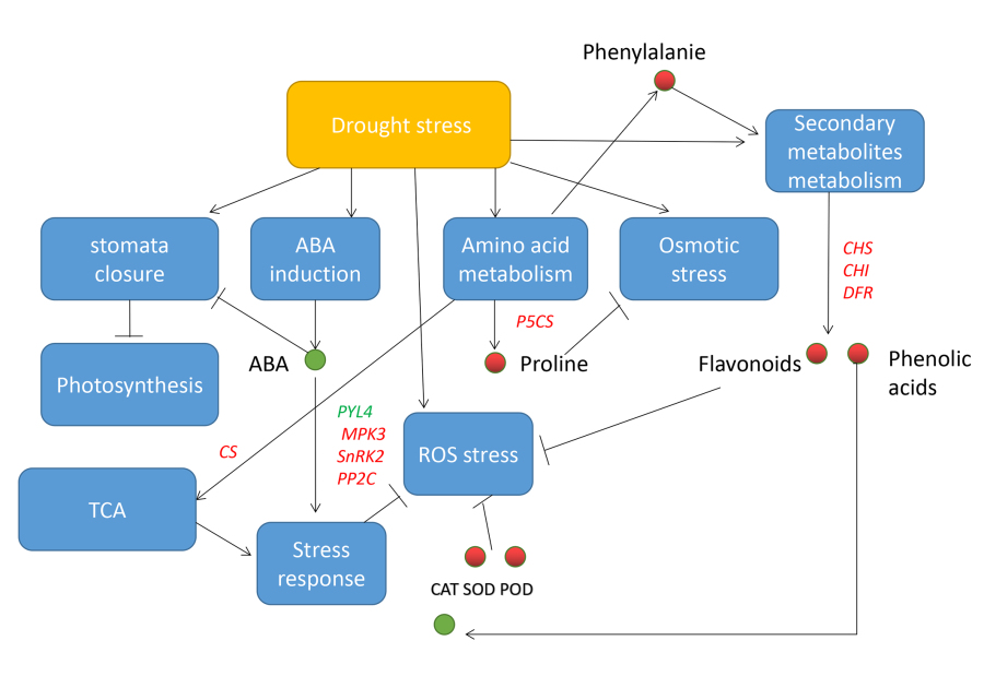 《Frontiers in Plant Science》近日在线发表了粮油所小麦研究中心题为“Different adaptive patterns of wheat with different drought tolerance under drought stresses and rehydration revealed by integrated metabolomic and transcriptomic analysis”的研究论文。小麦育种室前期育成的高产抗旱小麦品种冀麦418,表现出较好的抗旱节水性,为了进一步挖掘其抗旱节水基因并解析其调控机制,本研究对3个耐旱性不同的小麦材料(耐旱突变体Mu >普通小麦冀麦418 >干旱易感突变体mu)在中、重度干旱胁迫和复水化条件下结合生理和生化指标进行转录组学和代谢组学分析。研究表明黄酮类化合物在抗旱性中起着重要作用,干旱条件下富集的途径主要包括次生代谢产物的生物合成、代谢途径和光合作用。与渗透调节、抗氧化酶活性和ABA信号通路相关的代谢产物和基因在Mu中富集程度高于CK和mu。抗氧化酶活性的提高和黄酮类化合物含量的显著增加了氨基酸的生物合成能力和ROS清除能力,这可能是Mu抗旱性增强的内在机制。获得的3个候选基因及3个潜在代谢物可能有助于Mu快速可逆ROS损伤的恢复和氨基酸生物合成。本研究为复杂干旱条件下小麦的生理机制提供了新的认识,为阐明其生物功能及在小麦遗传改良中的应用奠定了基础。