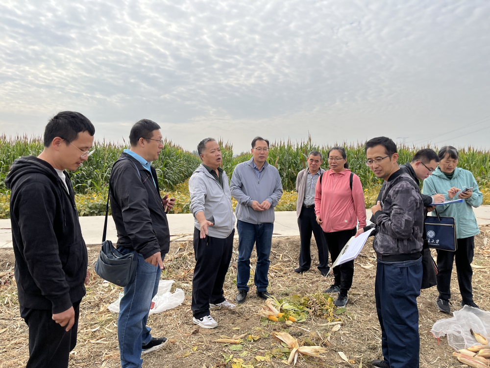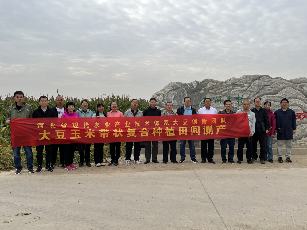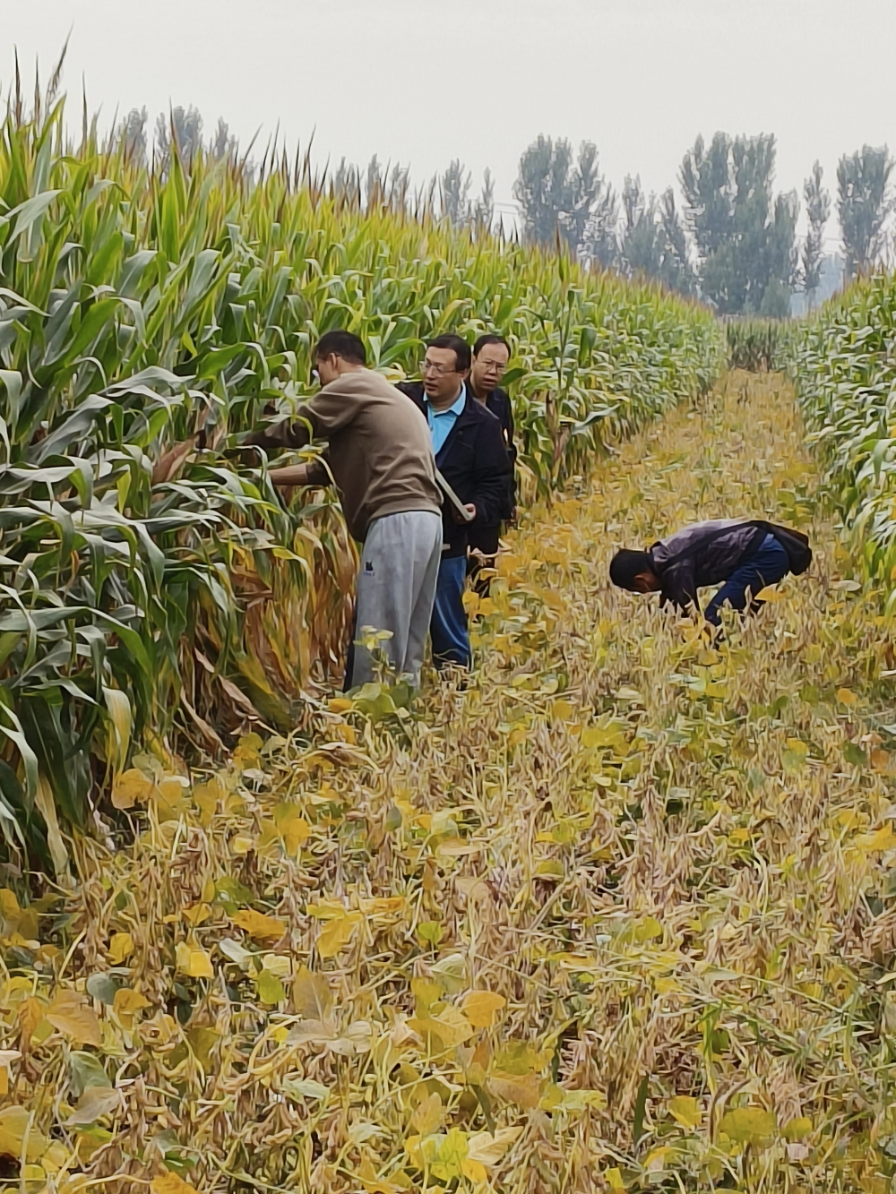 2023年10月7日,河北省大豆产业技术体系岗位专家高占林研究员、李喜焕教授和冯晓静教授邀请河北农业大学植物保护学院张金林教授、保定市农科院柳术杰研究员、保定市植保植检站陈红岩推广研究员、安新县植保植检站李虎群推广研究员、保定市种子站田丰站长组成专家组,赴保定满城区对大豆玉米带状复合种植样板田进行实地考察和田间测产。测产地块大豆玉米带状复合种植模式分别为6:4和4:2,面积均为20亩,大豆品种为冀豆12,玉米品种为冀农707。