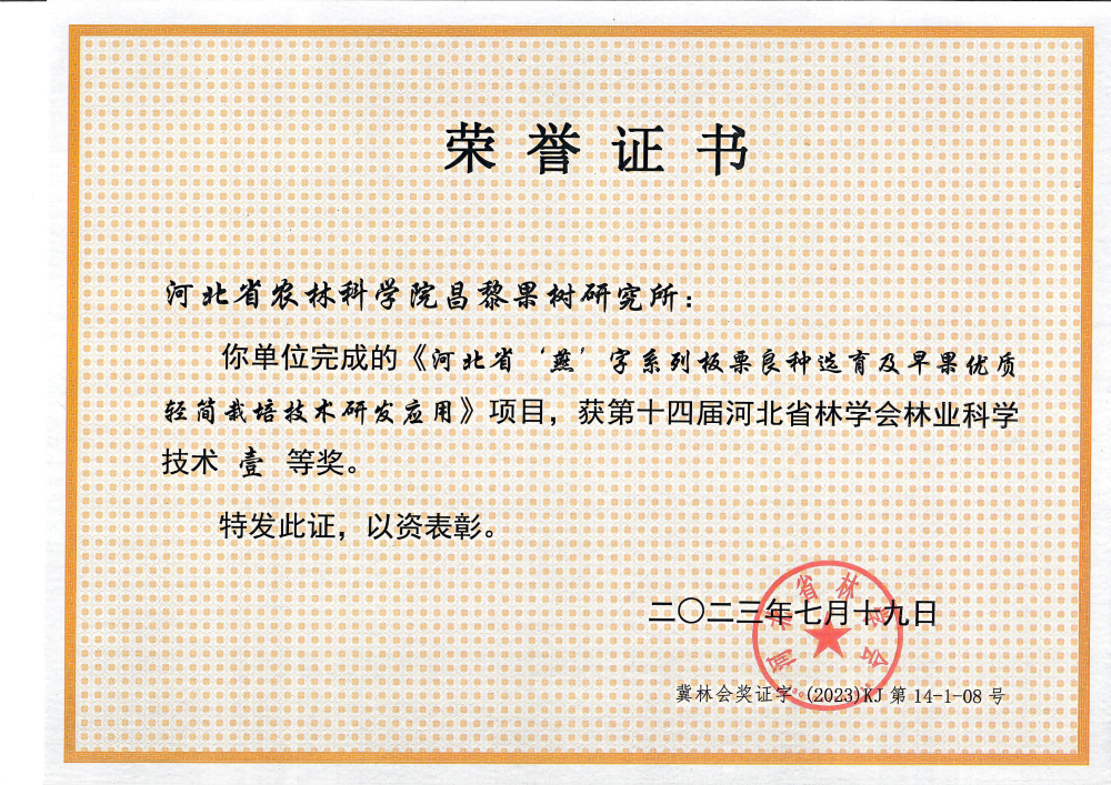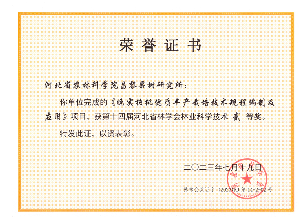 2023年10月27日,河北省林学会第七届林业学术大会召开,大会对“第十四届河北省林业科学技术奖”获奖项目进行颁奖,昌果所2项成果分别荣获一、二等奖。