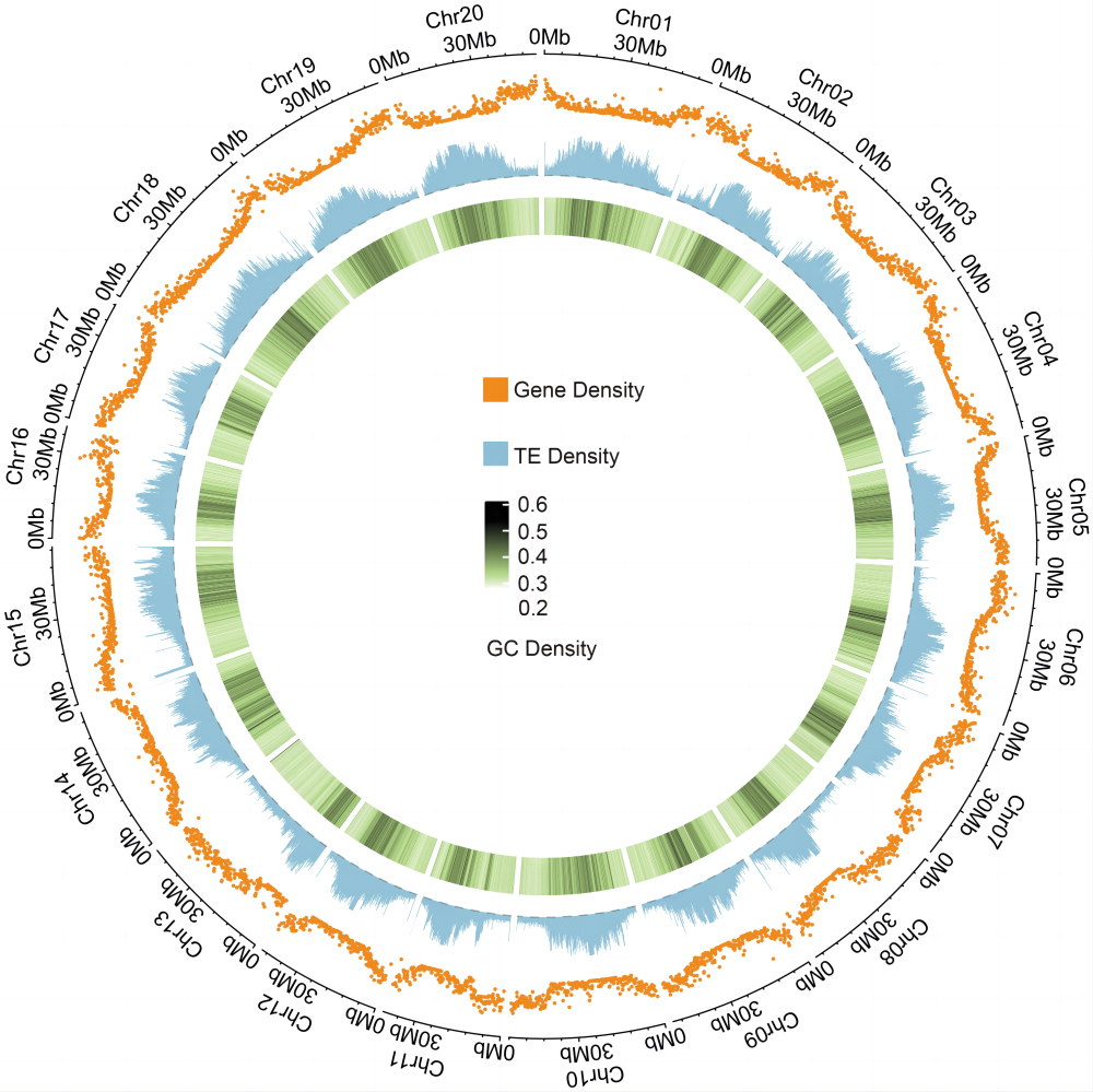 本研究结合基因组二代测序、基因组三代测序、染色质捕获等技术,将基因组组装到染色体水平。组装基因组长度为1041.94 Mb,contig N50长度和scaffold N50的长度分别为19.32 Mb和51.43 Mb,共注释出54,550个基因,CEGMA和BUSCO检测结果分别为97.18%和99.4%,相关指标达到同期一流水平。研究结果为通过分子设计育种培育突破性高蛋白大豆新品种奠定了基础。