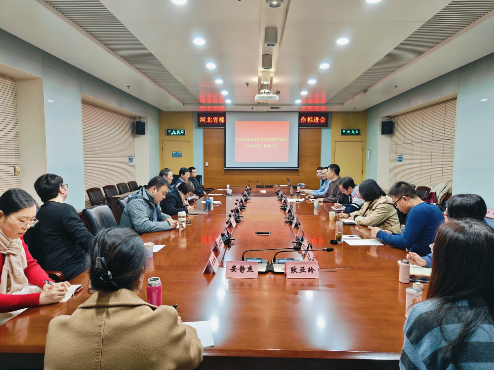 2024年3月9日,河北省棉花产业体系植保岗召开2024年度工作推进会。会议邀请北京市农林科学院质量标准与检测技术研究所潘立刚研究员、河北农业大学植物保护学院刘颖超教授和唐博文副教授、我院粮油所王贵启研究员和植保所潘文亮研究员作为专家,为项目的工作实施和安排部署进行点评和指导,省农业农村厅植保植检总站、河北工程大学、我院棉花所和植保所等参加单位团队成员参加会议。
