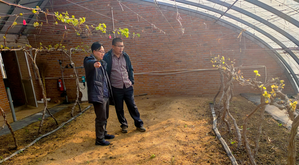 随后,韩斌研究员带领王海波研究员参观了位于昌黎果树研究所内的多抗性葡萄砧木复选圃、施各庄葡萄砧穗组合试验温室,对种质创新与评价、砧穗组合试验示范情况进行了汇报。王海波研究员对砧木评价与改良岗位开展的工作给与高度评价,建议今后在砧木营养元素吸收与利用、基因编辑等方面加深两岗位合作研究。