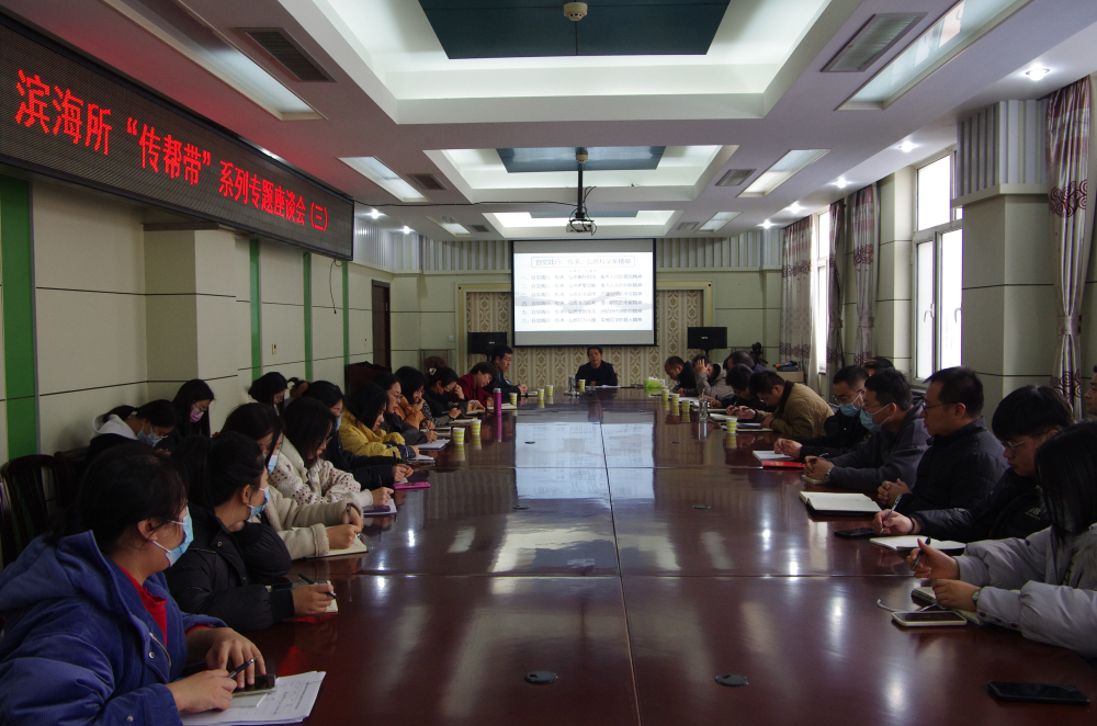 2023年12月18日,滨海所召开“自觉践行传承弘扬科学家精神”传帮带系列专题座谈会(三)。会议由所党总支书记刘善资同志主持,全所党员干部职工参加会议。会上,刘善资所长以《自觉践行、传承、弘扬科学家精神》为题,系统阐述了新时期科学家精神的时代内涵,并结合研究所工作实际,全面阐明了如何“自觉践行传承弘扬胸怀祖国、服务人民的爱国精神,勇攀高峰、敢为人先的创新精神,追求真理、严谨治学的求实精神,淡泊名利、潜心研究的奉献精神,集智攻关、团结协作的协同精神,甘为人梯、奖掖后学的育人精神”等六个方面的路径、方法、要求。