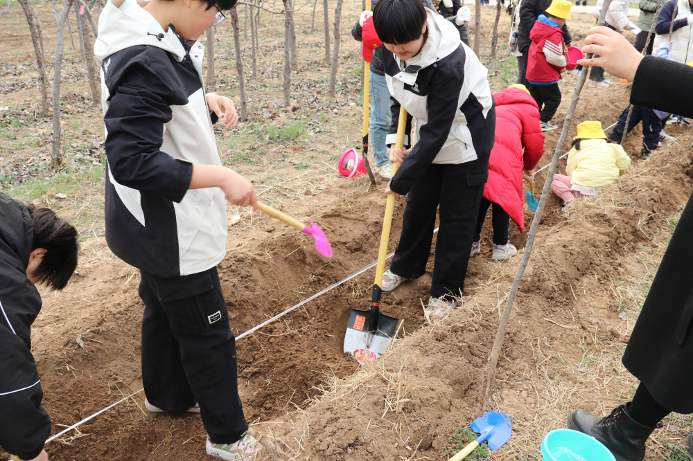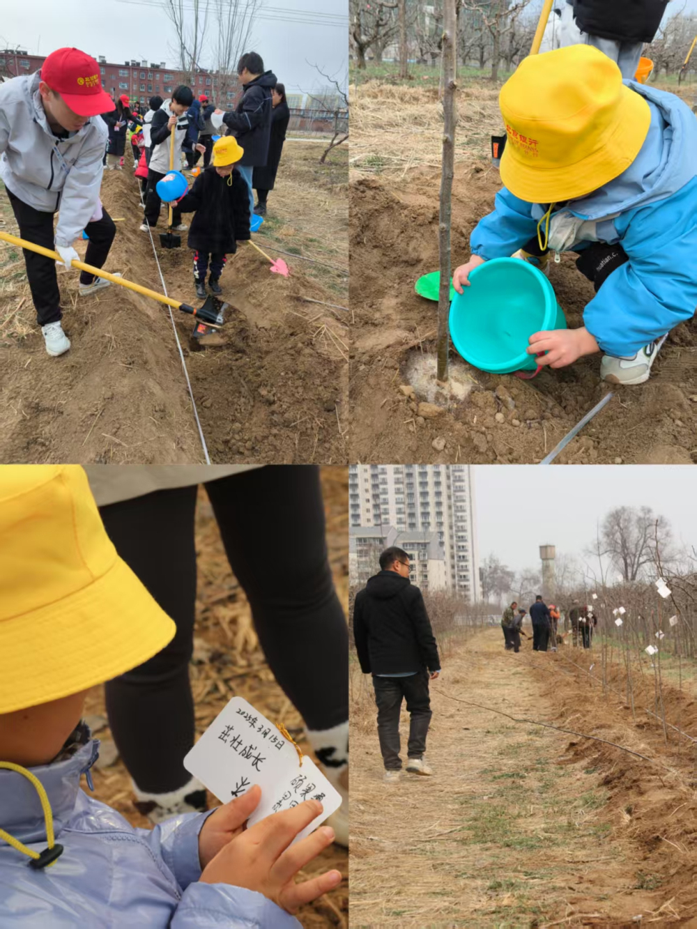 最后,25组亲子家庭到梨研究室试材地进行梨实生苗种植活动。梨研究室王晋博士详细讲解了梨苗的种植要点,并进行了实地操作。讲解完毕后,孩子们手持小铁锹和水桶,同家长们一起合力完成挖坑、栽种、填土、浇水等每一个步骤,并将写有自己名字的卡片挂在梨苗上。在整个种植过程中,王晋博士始终在一旁密切关注,随时提供专业的技术指导,耐心解答大家提出的各种疑问。活动现场一片欢声笑语,洋溢着温馨与幸福的气息。在亲手种植梨苗的过程中,孩子们不仅学到了实用的果树知识与技能,更深刻体会到了劳动的价值和大自然的神奇力量。